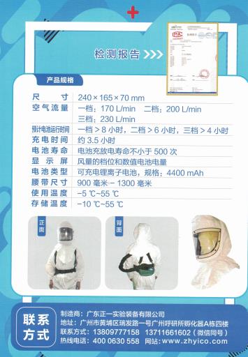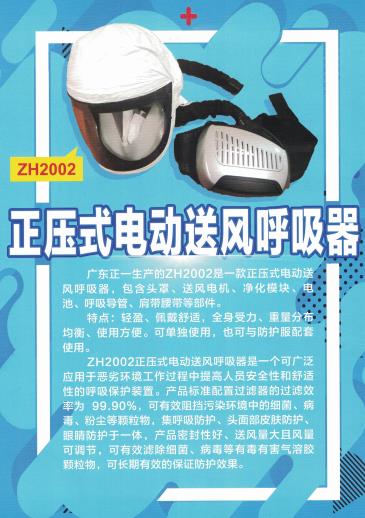 廣東正一生產的該產品(ZH2002)是一款正壓式電動送風呼吸器。產品主機包含頭罩、送風機